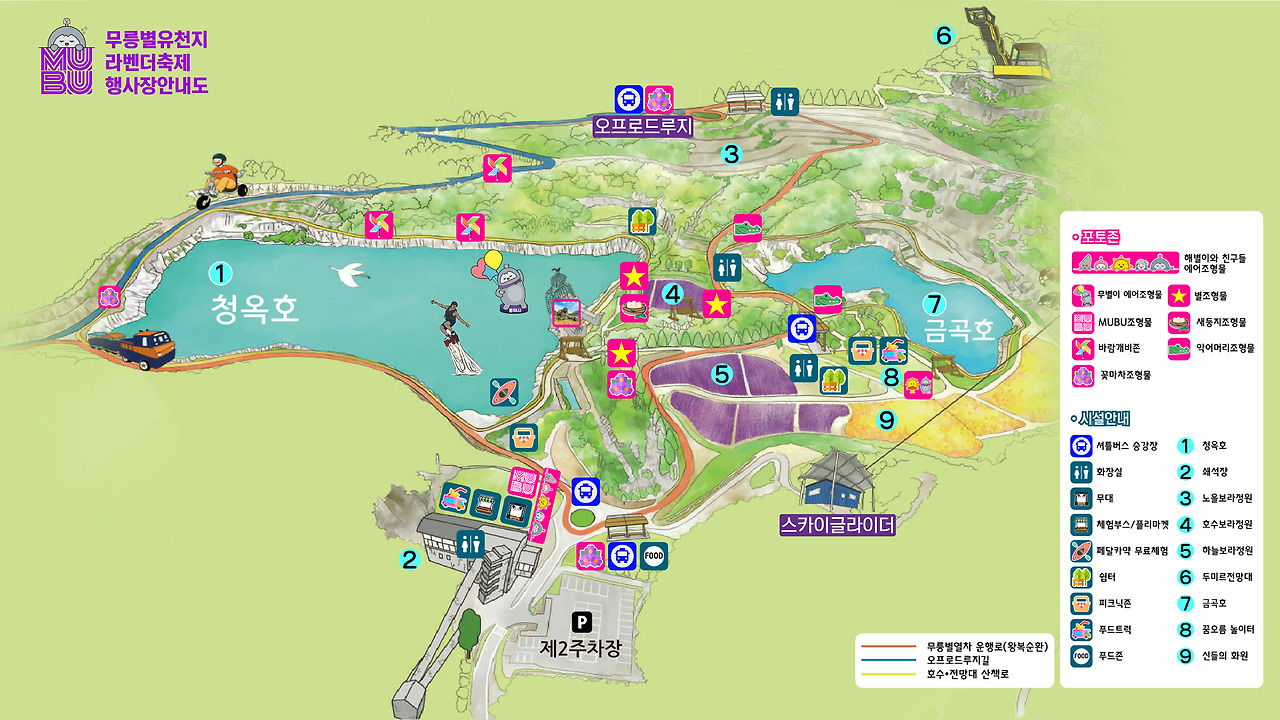 청옥호 둘레길 트래킹 프로그램은 무릉별유천지 청옥호 주변 약 2km를 1시간 정도 걷는 코스로 매주 토요일 17시에 진행됩니다. 참여 인원은 30명 내외로 참가자에게 소정의 상품을 지급합니다. 청옥호 위치는 아래에 있는 행사장 안내도를 참고하세요.