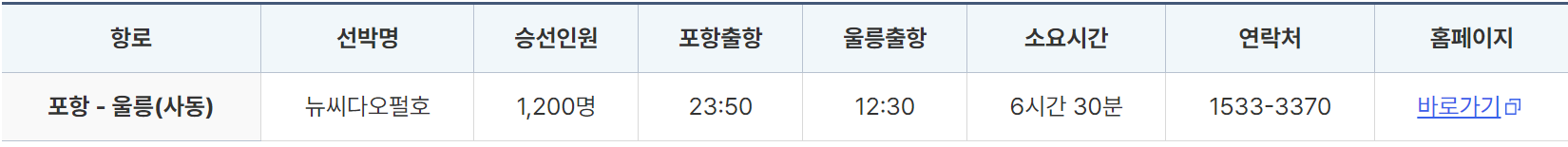 울릉도 여행을 계획할 때 가장 먼저 배편을 예약해야 합니다. 울릉도로 들어가는 배편은 총 4곳(포항, 묵호, 후포, 강릉)이 있어서 가장 가까운 곳으로 선택하면 되지만, 만약 멀기가 심한 분이라면 울릉 썬플라워 크루즈호(후포), 뉴씨다오펄호(포항)를 고려해 보세요. 그리고 배마다 울릉도에 도착하는 항구가 다르므로 여행 동선을 고려하여 배 또는 숙소를 고민해 보세요.