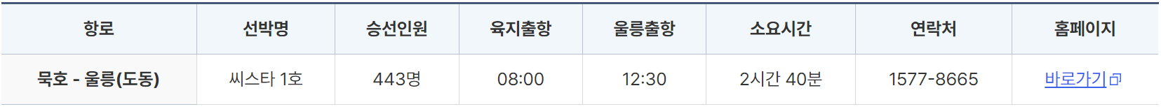 울릉도 여행을 계획할 때 가장 먼저 배편을 예약해야 합니다. 울릉도로 들어가는 배편은 총 4곳(포항, 묵호, 후포, 강릉)이 있어서 가장 가까운 곳으로 선택하면 되지만, 만약 멀기가 심한 분이라면 울릉 썬플라워 크루즈호(후포), 뉴씨다오펄호(포항)를 고려해 보세요. 그리고 배마다 울릉도에 도착하는 항구가 다르므로 여행 동선을 고려하여 배 또는 숙소를 고민해 보세요.