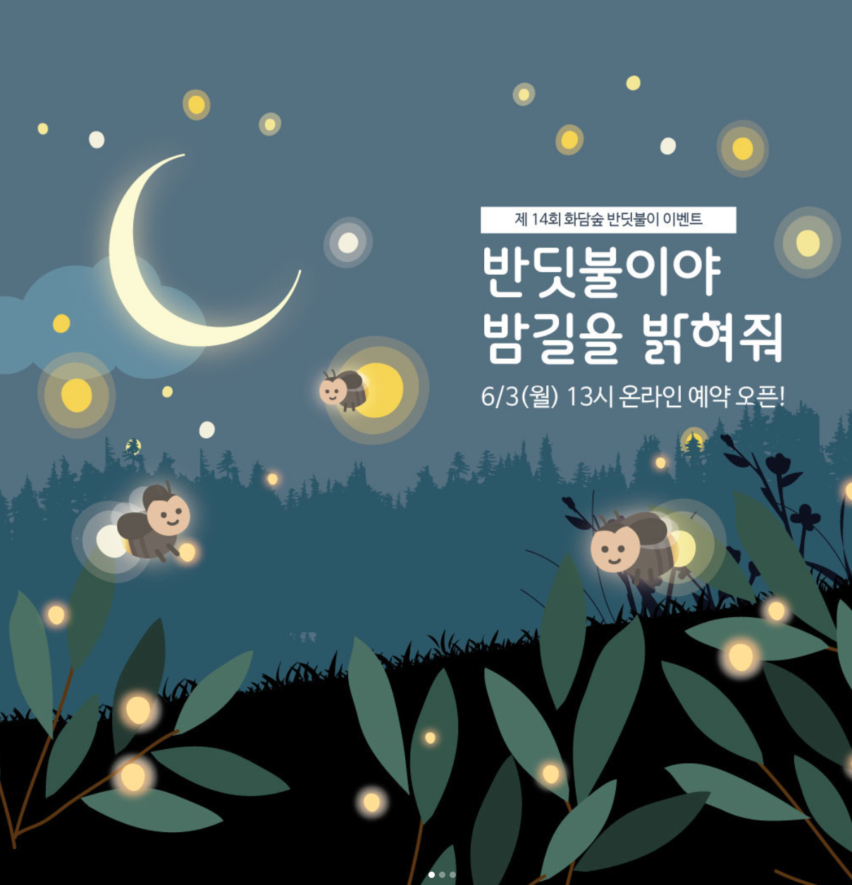 여름밤 까만 하늘을 수놓는 반딧불이를 보신 적 있으신가요? 쉽게 보기 힘든 반딧불이를 경기도 광주 화담숲에서 볼 수 있습니다. 화담숲에서는 매년 여름밤 반딧불이 이벤트를 진행하는데요. 도심에서 만나기 어려운 반딧불이를 직접 볼 수 있는 절호의 기회입니다. 까만 밤하늘의 반짝이는 별빛처럼 화담숲을 수놓는 반딧불이와 함께 한여름 밤의 찬란한 추억을 만들어 보시기를 바랍니다.